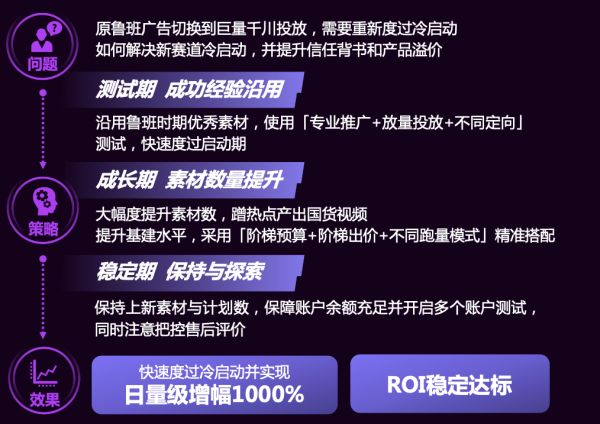 专注于释压的功能性家居品牌翼眠,计划转移营销阵地,希望能够快速度过新平台冷启动期,提升信任背书和产品溢价。投放巨量引擎“智推家”效果广告后,翼眠首先通过沿用原平台的优秀素材,使用专业推广+放量投放相搭配的出价方式,快速打开新平台营销局面;大幅度提升素材数和质量,蹭热点产出了国货优质视频,并在新平台提升基建水平,“阶梯预算+阶梯出价+不同跑量模式”精准搭配,在新赛道有了新突破;进入稳定期后,翼眠持续保持上新素材与计划数,同时注意把控售后评价。科学的运营策略,不仅助力翼眠顺利实现营销平台换挡,而且日量级增幅1000%,ROI稳定达标。