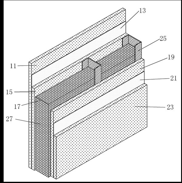 第一隔音层13、第一衬板层15、吸音层17、第二衬板层19、第二隔音层21和饰面层23在墙体上形成阻隔噪音的隔断墙体,当噪音传递至隔断墙体上时,噪音能被隔断墙体阻断,进而无法继续向前传递,以达到提高隔音效果的目的。墙体可以是外立面,也可以其他的墙体。
