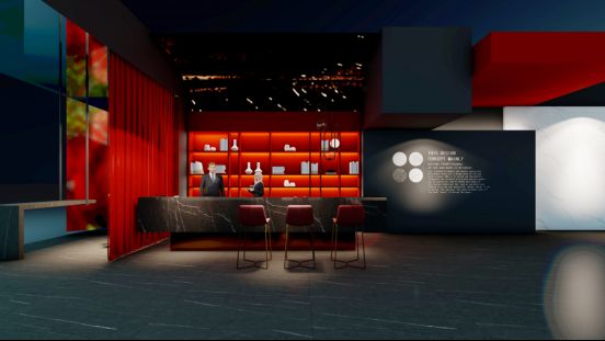 新润成瓷砖严选风潮馆,本次展位共390㎡,是科技与艺术性相结合的体验式展会,这是一场场关于物质本源的展览。在有限的空间内,启用黑白灰简约的基调,辅以润成红元素的点缀,创造出更多的对话可能性。