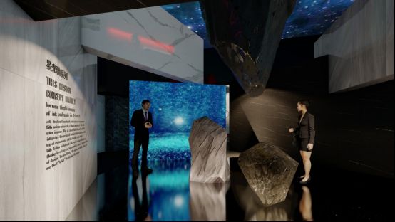 它由“星光釉”层压打造,充满着反差的梦幻,以结构的干涉,引导出曲折的动线,顶端做星空投影,仿佛进入一个平行时空,震撼而浪漫,星空就在你眼前。使观者在有限的场地中感受到丰富的浩瀚星空。