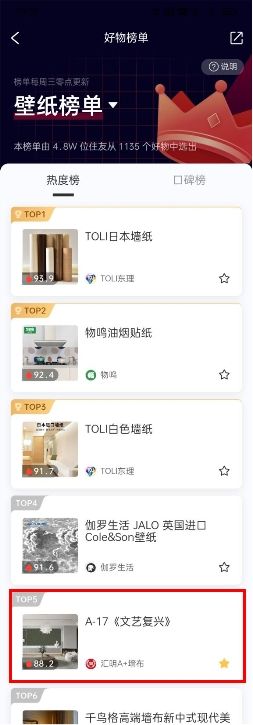 在好好住联合各大家居生活产品品牌的新品速递活动中,汇明A+墙布入选壁纸热度榜单TOP5。本次榜单由4.8万住友从1135个产品中选出,入选前五榜单是品牌实力和品质的体现。