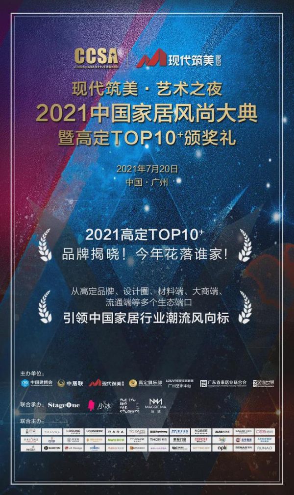 CCSA中国家居风尚大典暨高定TOP10+颁奖礼已成为行业最受关注的大热点,成为了家居行业的超级生态IP。从高定品牌、设计圈、材料端、大商端、流通端等多个生态端口,引领中国家居行业潮流风向标。2021CCSA将携手现代筑美家居重磅共同打造“现代筑美·艺术之夜”中国家居风尚大典暨中国高定TOP10+颁奖礼。