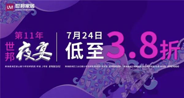 2021年7月25日起,广东省珠海市世邦家居将举行第11届世邦夜宴活动,在过去的10年中,世邦家居通过促销活动为珠海市民提供优质的商家、优越的服务以及优惠的让利。而在今年,世邦家居将继续用多年不变的热情,同心协力地为这个一年一度的盛宴做好准备,迎接世邦夜宴的又一成功,为珠海市民提供更多生活便利。