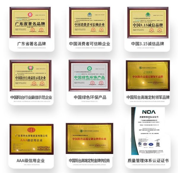 享时光拥有标准化的生产基地和智造一体化的生产线,凭借着高质量的产品品质,三维合一的创新模式,体系化的服务能力,荣获“ISO9001质量管理体系认证”、“中国阳台高端定制领军品牌”、“中国绿色环保产品”等数十项荣誉,领跑阳台整装定制新风向!