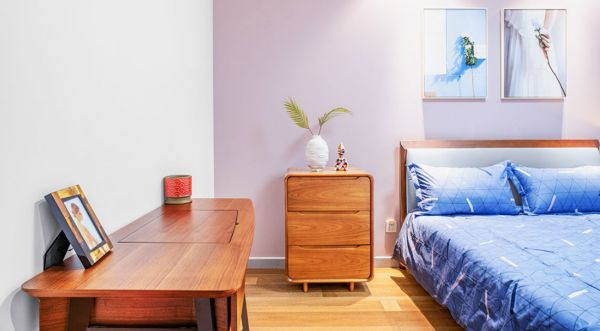 再来看看这款设计中的主卧与次卧,两个房间不约而同都保持了安静、澄明、清朗的设计语言,这样的氛围是相当适合人休息的。主卧还设计了一处小工作台,这样卧室关上门以后,就会成为一个安静的工作间,读书、工作、学习均可,并不占太大空间。