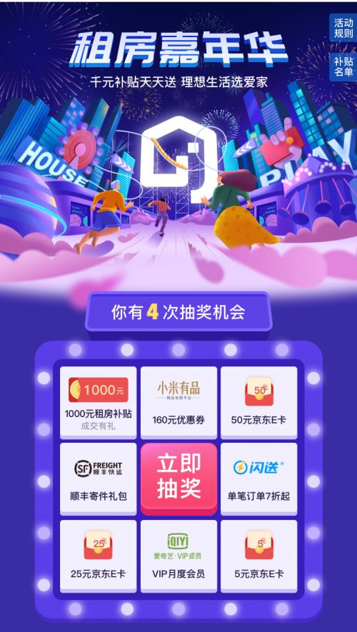 除租房补贴券之外,本次活动还为客户准备京东E卡现金券、爱奇艺月度会员、品牌合作礼券等万余份奖品。