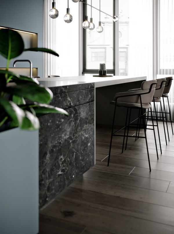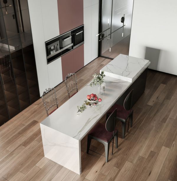 值得注意的是,在场景内拜勒尼并没有将饰面板打造为家居形态,而是以板材这一最本真的形态出现与其他元素结合,如隔板同办公椅打造的办公空间,操作台同炉灶营造厨房空间,错落的产品板和门洞配合出门板使用趋向等,简单的表达有着更多的想象空间,探索产品在应用上的无限可能性。