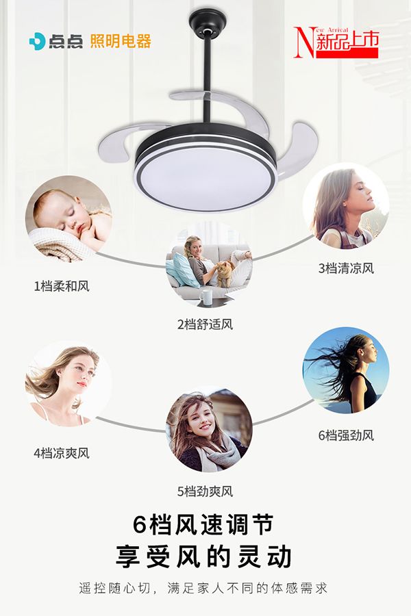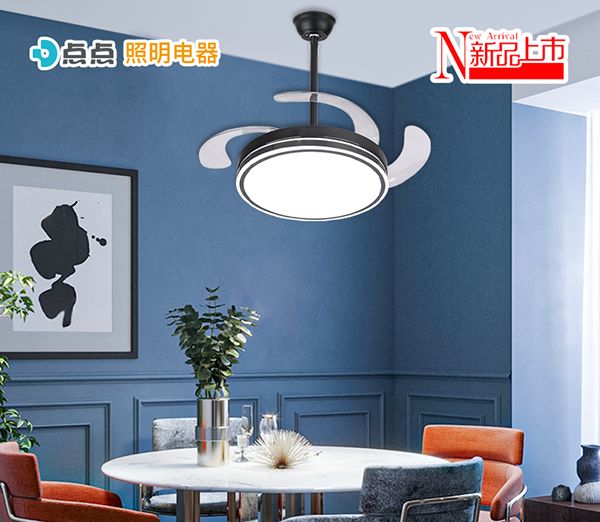 点点照明新品风扇灯与传统的吊扇相比,具有隐形风扇、六档可调、智能控制、全铜电机、直流变频、低声无噪等优势,让风扇灯能够更好地适应当下的家居环境。