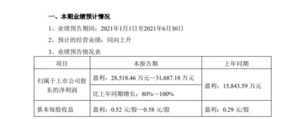 大亚圣象(000910.SZ)7月14日发布业绩预告,预计2021年上半年归属于上市公司股东的净利润2.85亿元至3.17亿元,同比增长80%-100%;基本每股收益盈利0.52元-0.58元。