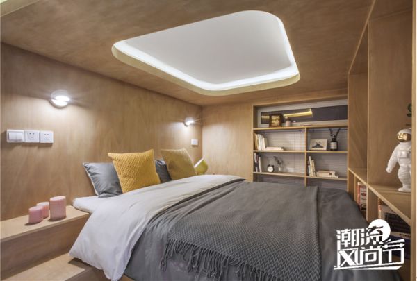 然而,这些被整合功能的体块置入小空间后会出现一些矛盾,特别是在娱乐功能体块置入后, 整个空间的流线与视野都被遮挡。为此,TOWOdesign对原本的设计做出调整,将所有功能体块整体旋转10度后,功能块带来的阻挡问题迎刃而解。同时10度的倾斜也创造出一些有趣的夹角空间。在休息用的盒子旁边,该夹角空间正好容下上床楼梯,楼梯内暗藏收纳柜,灵活又实用。客厅的夹角空间变成三角形造型灯箱,成为客厅的氛围照明灯。