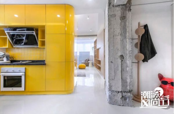 负责烹饪的黄色盒子,与背部的柜子结构一起,成为整个空间视觉焦点。