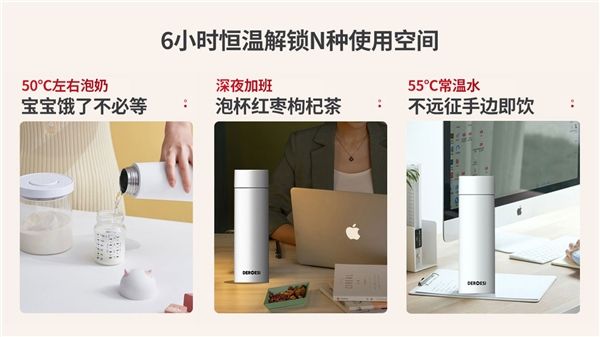 德尔赫斯石墨烯恒温杯,运用诺贝尔奖科技材料--石墨烯为核心原材料。石墨烯具有高热导率的特性,使得水杯更小体积空间具有更高效的吸热储热性能,来实现100℃沸水变58℃温水,恒温时间长达6小时以上。且杯内水温温度可视,开盖即饮,随时随地喝上暖心暖胃的温开水。适合便携、旅行、家用等各种需求,更加密切的与生活相联结,科技源于生活,只为更好地服务于生活。