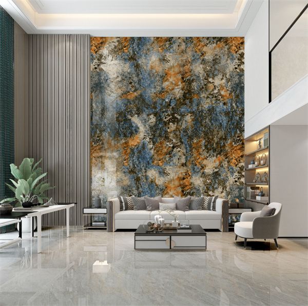 2021欧神诺新品云光系列——春华秋实,活泼团状纹理,颜色层次丰富,蓝、黄、金、灰、黑色交织叠加,整体营造出岁物丰成、春花秋实的锦绣场景,赋予空间个性飞扬、趣味盎然的气质。