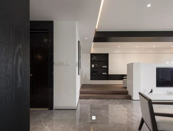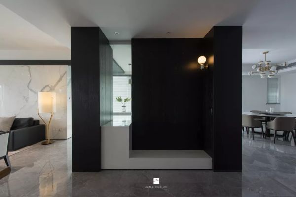 玄关贯穿餐厅、客厅、茶室空间,巧妙而让空间具有隐蔽性