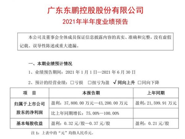 7月13日,东鹏控股(003012SZ)日发布2021年半年度业绩预告,预计业绩向上增长。报告期内,归属于上市公司股东的净利润37,800.00万元—43,200.00万元,比上年同期增长75.00%—100.00%;基本每股收益0.32元/股—0.37元/股。