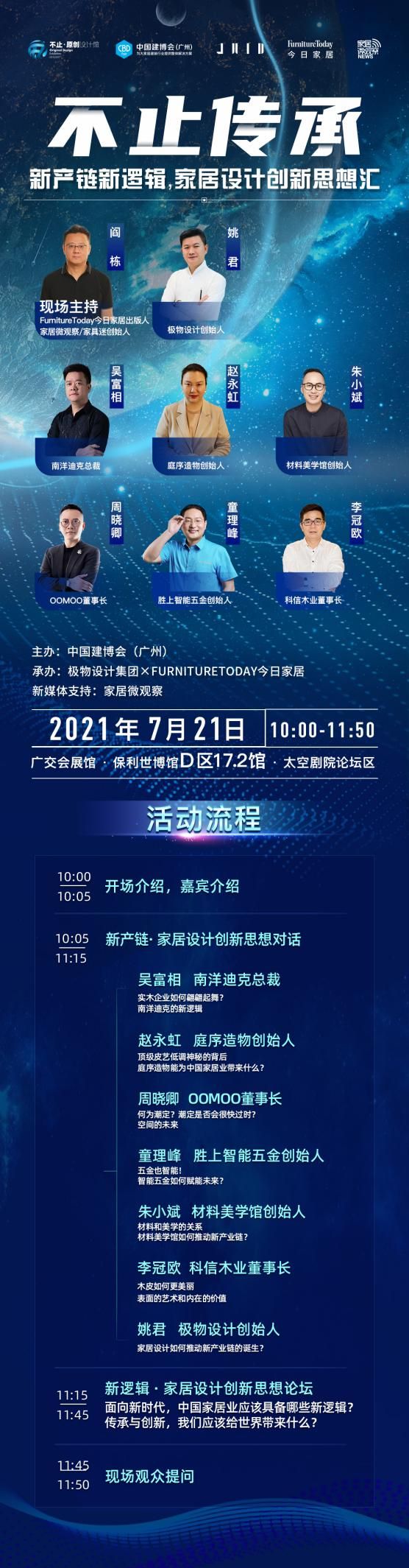 而在这个小剧场中,还将举办多个不同主题的论坛和主题活动。其中,7月21日上午10点,由中国建博会(广州)携手极物设计集团、FurnitureToday今日家居共同举办的“不止传承—新产链新逻辑,家居设计创新思想汇”,FurnitureToday今日家居出版人、家居微观察/家具迷创始人阎栋,携手极物设计创始人姚君,与六位行业大咖——南洋迪克总裁吴富相、庭序造物创始人赵永虹、材料美学馆创始人朱小斌、OOMOO董事长周晓卿、胜上智能五金创始人童理峰,科信木业董事长李冠欧,共同带来一场精彩的家居思辨会。