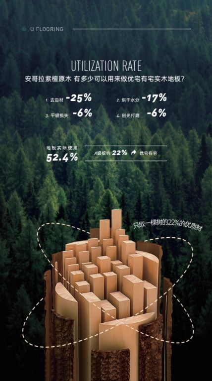 优宅有宅基于低碳环保和科学砍伐理念,选取成材百年以上的亚花梨(安哥拉紫檀)原木,根据木材的生长特性和不同用途,将初次"养生"的原木进行有序切割。每一根原木,只取其中树脂沉淀、水分含量等方面都处于适中状态的22%优质原材,以确保地板的稳定性。