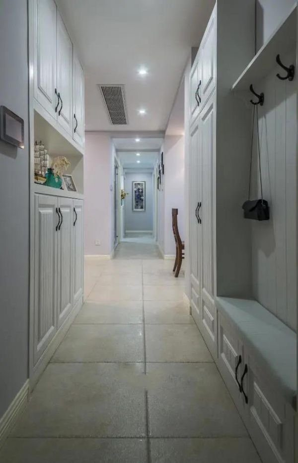 从玄关开始,就是两侧到顶的柜子,小小的玄关也跟个衣帽间似的,收纳空间特别给力。