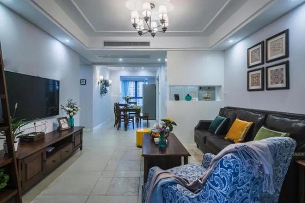 定制的柜子和家具都不一样,家具都是深色实木的,比如茶几和电视柜,电视墙也没有做造型,虽然吊顶很简单,但是出来的效果漂亮又时尚。