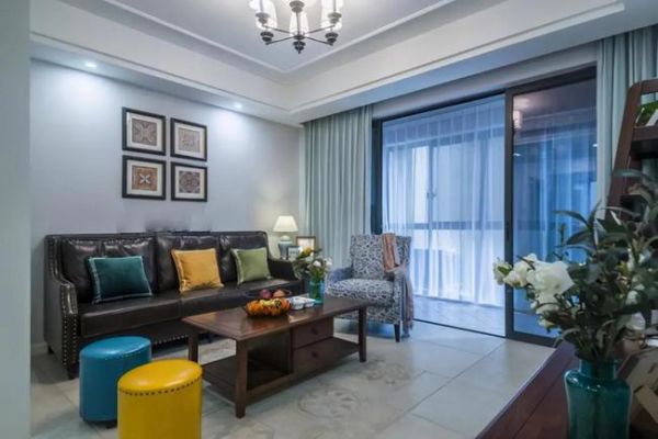 客厅和阳台是连在一起的,沙发背景墙没有造型,只是挂了四幅装饰画,黑色的皮质沙发挺有美式风格的粗犷感的,柳钉的细节元素给人一种朋克的摇滚效果