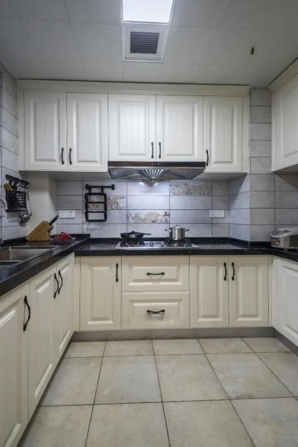 厨房不大,但是也是装的U字型的整体橱柜,没有窗户的墙面吊柜都装得很满,满足厨房的收纳。