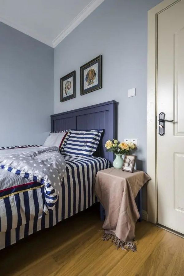 儿童房的床是买的美式的床,蓝色的烤漆材质挺好看的,搭配海洋系的床品布艺,充满童趣色彩。