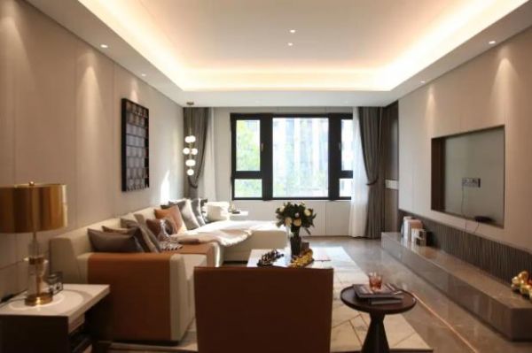 大客厅的5米的智能电动窗帘,可以通过语音、APP或者配合相应的场景实现窗帘的开合,开合幅度随心控制。