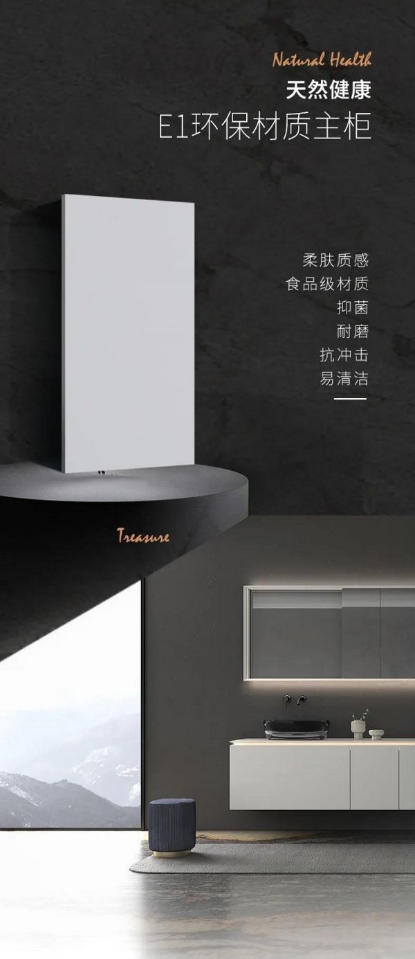 E1环保材质主柜,天然更健康;水晶树脂盆,时尚美观,易清洁,防腐蚀;FENIX(菲尼克斯)进口肤感板材,拥有细腻柔肤质感。LED木镜柜,四周柔性灯光手扫感应,兼具储物和化妆功能,带来更便捷的照明体验同时,能衬托浴室氛围,给生活带来更多舒适体验。