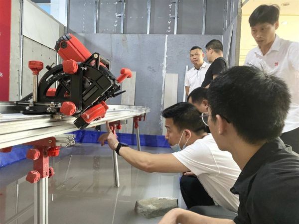 7月17日,广东分公司邀请岩板生产企业的销售人员现场体验电动大板切割机,通过现场体验和实际操作了解产品功能,在之后的交流中,到场的销售人员都对产品赞不绝口。目前岩板虽火,但终端加工和应用始终是瓶颈,可以现场加工的电动切割机可以免去搬运的环节,大大降低加工成本。
