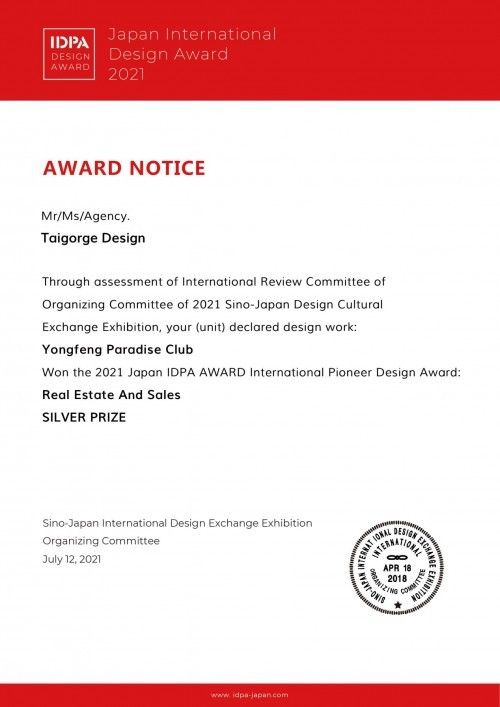 近期,于日本东京举办的第3届“IDPA AWARDS国际先锋设计大奖赛”暨“中日国际设计文化交流展活动”公布获奖名单,经过激烈的角逐,太谷形上设计作品《郑州荥阳永丰乐境会所》,成功荣获IDPA“地产售楼设计类”银奖。与此同时,经第16届“金外滩”奖的严格评选,该设计作品也成功入围金外滩奖“最佳售楼处空间奖”。