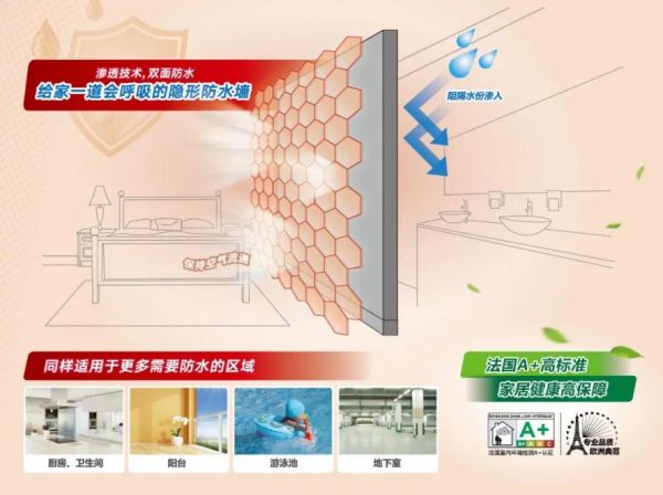 通K具有渗透结晶功能,也就是“皮肤式防水”,给墙体加上通K这层皮肤,既让墙体结构内部的水蒸气外排,同时外部水分又无法进入,双面防水,能够增强结构层的耐久性,起到更持久的保护作用。