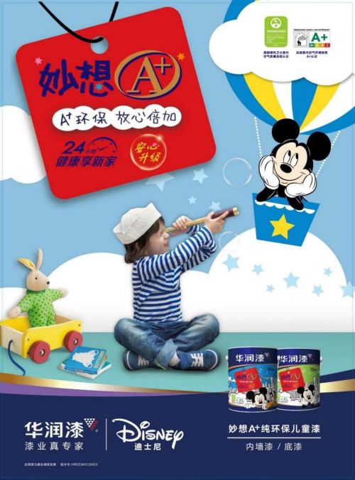 其次幼儿成长过程中,在经历绘画发展的历程,容易进行涂鸦。华润漆妙想A+儿童漆,漆膜致密坚韧,有效抵抗上万次擦洗,用抹布或白板擦便能轻易解除“墙面危机”。更推出了“妙想A+”迪士尼儿童房主题模板,再配合妙想A+系列环保儿童涂料,丰富了儿童房装修方案。