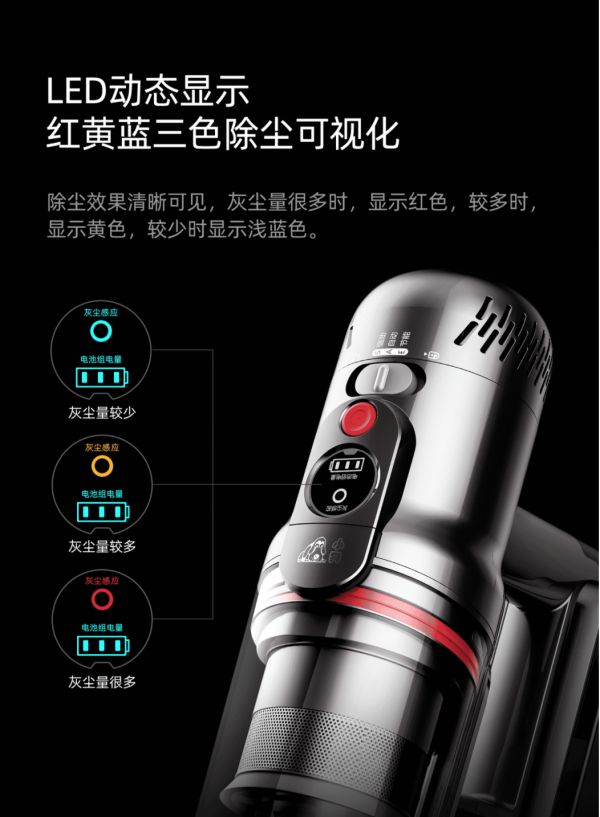 小狗T12 Pro Rinse的整机吸入功率高达185AW,是小狗无线吸尘器迄今为止吸力最强款,稳居现阶段国内无线手持吸尘器市场第一梯队;智能数字化除尘系统可以通过红外线分析气流中的微尘数量,在自动档清洁模式下自动调节功率大小,灰尘越多吸力越强,LED动态显示屏通过红黄蓝三色变化实现除尘可视化,用户第一时间可掌握清洁区域的脏污程度。