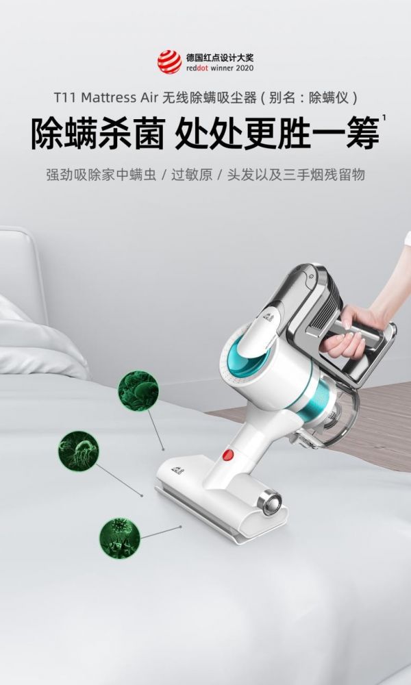 螨虫一直是敏感体质家庭、有孩子家庭及养宠家庭的重要危害之一,严重情况会直接导致家庭成员的健康问题,而清洗、晾晒这些日常手段无法彻底抑制螨虫繁殖,想要有效除螨建议使用专业的除螨吸尘器。小狗T11 Mattress Air无线除螨吸尘器拥有140AW单电机吸入功率,急速气流可轻易清除灰尘、螨虫及排泄物、零食碎屑、头发、三手烟等异物,直接破坏螨虫赖以生存的环境。另外,多锥气旋技术加持,保证吸力持久且不易衰减;5重过滤技术的过滤效果达HEPA12级,拦截99.82%小至0.3微米的微尘,排风洁净,避免二次污染;275nm高频放射UV紫外线破坏细菌螨虫基因,强效杀菌除螨;高效档40分钟长续航,全部家庭成员的起居空间均可轻松清洁。