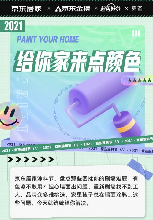 如何告别千篇一律的大白墙,把家“装”出高级感?京东居家联合京东金榜、发现好货、窝者发布的色彩家装指南——《给家来点颜色》为你指点迷津。京东大数据显示,2020年7月-2021年6月,有色漆品类成交额同比增长100%,增速高于油漆品类大盘,有色漆用户搜索量增速明显。随着有色漆进入越来越多家庭,能够营造温馨睡眠氛围的深色墙面,以及让家更具艺术气息的半墙主义、撞色设计等正在引领新生代的家装潮流。儿童漆因更环保逐渐成为有娃家庭的首选,儿童漆成交额同比增长60%;专门针对儿童涂鸦和居家DIY人群设计的黑板漆,以实用功能和新奇性受到关注。