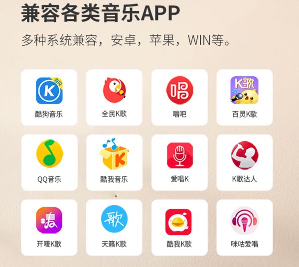 网友使用的酷狗音乐、唱吧、全民K歌、酷我K歌、咪咕爱唱等多种K歌软件都全部都支持使用,安卓、苹果、WINDOWS等系统平台完全适配