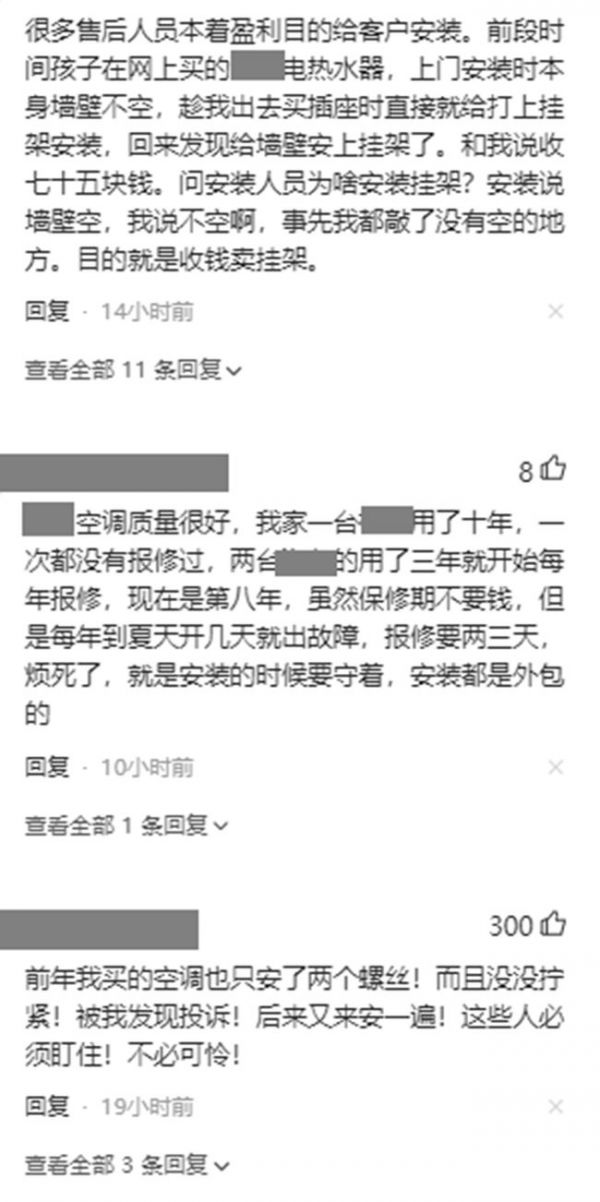 这件事曝光在网上后,网友们对之前安装工的不按规范操作充满了愤怒。网友表示:这种情况已经很常见了,现在安装空调时必须要盯着,不然就会少安装螺丝固定,并且空调外机从24楼掉下去可不是一件小事,安装工如此不按照规定执行,实在是没有职业道德和责任心,这样的人就不该从事这一行业。