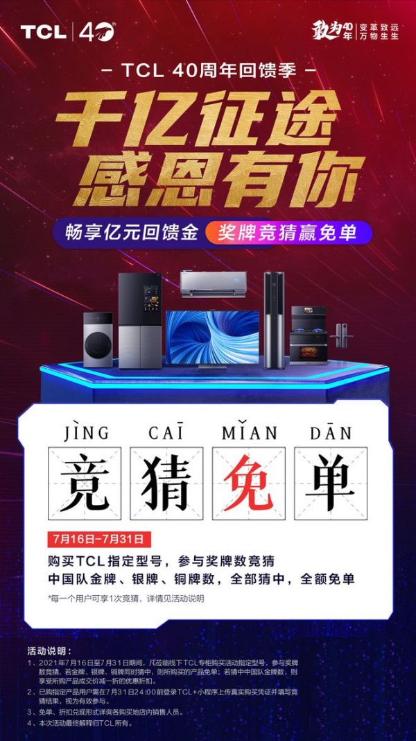 今年恰逢品牌40周年,加上即将到来的东京奥运会,TCL开启“千亿征途,感恩有你”40周年回馈季主题活动,7月16日-7月31日期间用户来到线下TCL专柜购买活动指定型号,参与2021年奥运会中国队奖牌数竞猜,若金牌、银牌、铜牌同时猜中则所购买的产品免单,猜对金牌数量则享受所购产品成交价减一折等活动,为用户送上极具诚意的优惠福利。