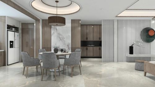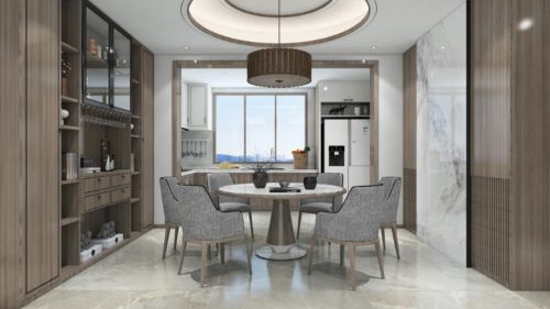 餐厅和客厅用白色条柱型装饰连接,给人以视觉的延伸,加强了整个空间的层次感和整体感,而涉及到具体分区时,又用不同于客厅方正布局的圆形吊顶和圆形吊灯,以及在木质背景墙中嵌入山水墨画纹理的瓷砖加以装饰,让餐厅既和客厅有所联系,突出新中式家居空间的方圆传统文化,又让餐厅独立于客厅之外,拥有两人三餐四季的温馨生活感。