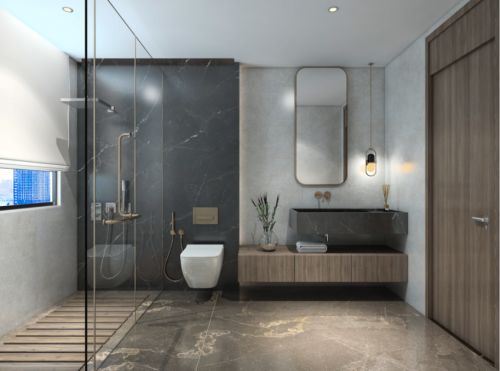 卫生间整体设计采用了明暗对比的手法,地面采用棕色系的陶瓷大板进行铺贴,墙面采用黑白两种色系岩板铺贴,给人以强烈的视觉冲击力,同时通过岩板把淋浴房和洗手区域明确区分开来,再搭配木纹浴室柜和卫生间门,不仅进一步增强了卫生间的层次感,同时高级感立显。