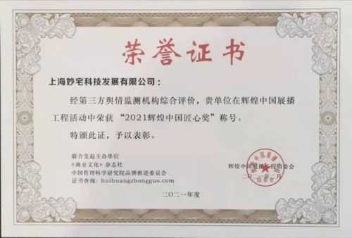 为庆祝建党100周年,“辉煌中国展播工程”活动在北京隆重举行。上海妙宅凭借多年来在促进健康产业发展、引领行业规范、增强民族品牌自信等方面所做出的贡献,喜获“2021辉煌中国匠心奖”荣誉称号。