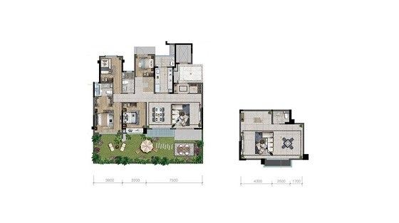本套户型的客厅区域与餐厅空间连通,拥有整幅超大落地窗,完美的采光、相对充裕的空间和开放的结构给予设计无限的灵感。