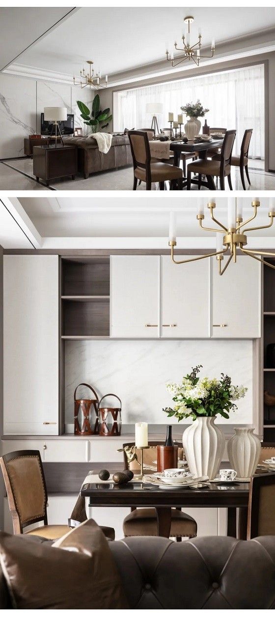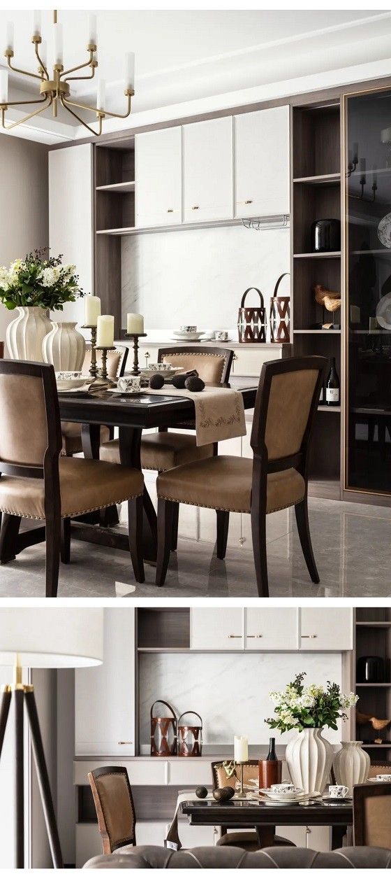 餐厅的一整面墙,为业主在确定了家具的风格和尺寸后,专门定制的柜子,所以比较契合整体软装风格。