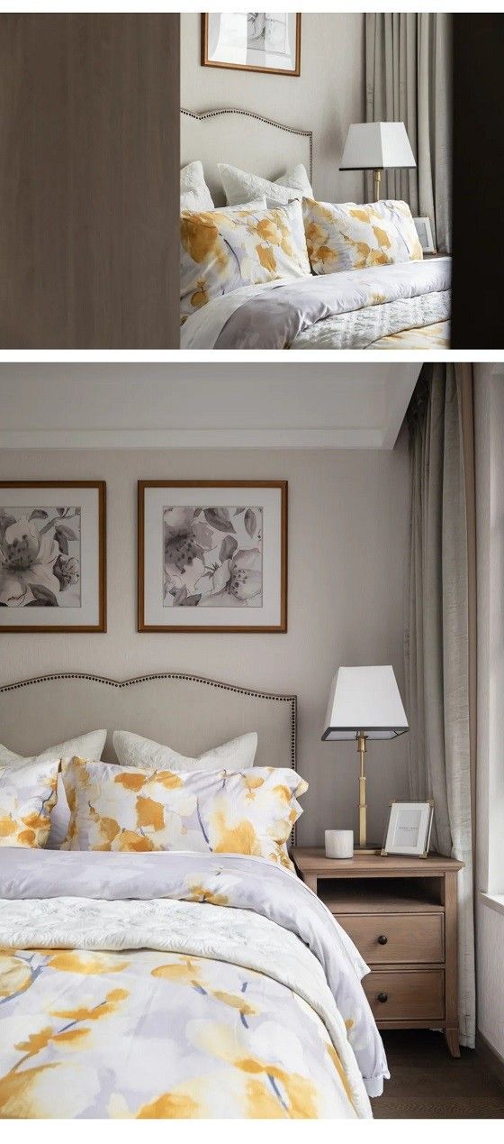 业主的家庭构成为1家6口的三代同堂,所以次卧也是常做老人房的空间,设计师为其搭配了一款简约别致的布艺软包床,淡雅的色彩,除却繁冗,静静流淌温柔生活的气韵。