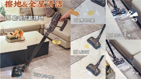 为什么叫擦地吸尘器,因为它吸尘、擦地能同时完成,小狗T12 Plus Rinse擦地吸尘器的核心共功能——旋转擦地刷,该地刷采取吸口前置设计,推动过程中先吸净地面上灰尘、毛发等各种脏污,避免脏东西打湿清洁布,后面设置了两个的圆形转盘及复合材质清洁布,高速旋转强力擦地,地面清洁吸擦同步搞定!可以说有了它,家里的拖把、抹布都可以下岗了~