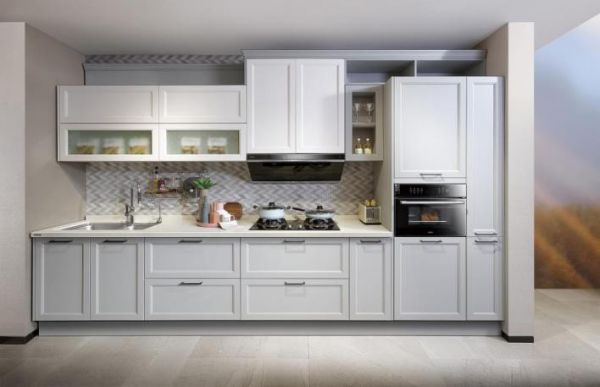 比如欧铂丽的现代简约风【莫兰迪】一字型橱柜,只需一面墙布置,区域组合简单利落,切洗、备餐、烹制一字排开,打造一个连贯的烹饪操作动线。