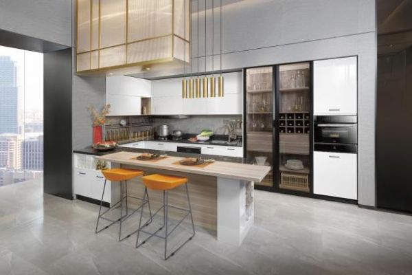 在设计房顶灯的时候,如果厨房偏大或房顶过高,尽量在主照明灯周围安装几个小射灯,保证厨房空间的足够亮度。比如欧铂丽【格调时光】,吊柜下均装上LED感应式吊柜底板灯,既安全又方便使用。玻璃柜内装上层板灯,提升视觉通透性,实用美观兼备。
