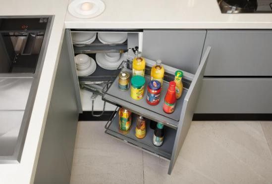 还有地柜的多功能拉篮设计,方便储存更多碗盘、杂物、餐具、大件锅具等等,大幅度提高空间利用率。