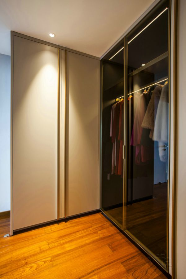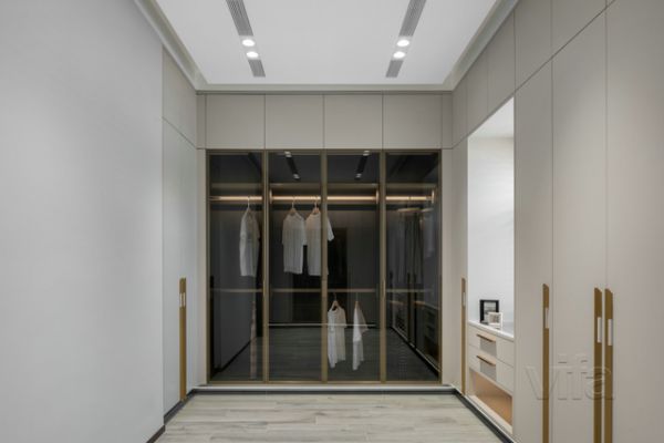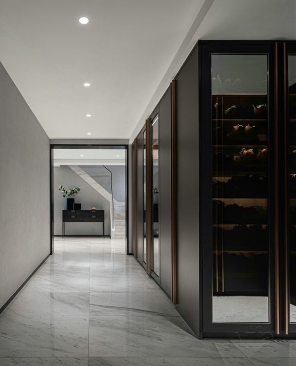 用衣柜替换原本属于走廊墙壁的位置,别具一格的巧思既合理利用了空间,又让走廊有了更多可进行设计发挥的可能性。镁铝合金玻璃柜可以给人一种视觉上的延伸感,同时也让服饰摆放一目了然。