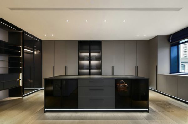 服饰的多样性反而要求衣帽间越简约越好,整个衣帽间摒弃一切多余的修饰,只选择了绒面咖和绒面灰两个沉稳的颜色,再加上顶天立地的定制衣柜共同构建了空间的完整性,更显庄重大气。同时,利用不同材质强调立体感,让整体设计更加考究。中间设计一个导台,可以用来收纳展示女主人的各种珠宝首饰和男主人的领带皮带,高级感触手可得。